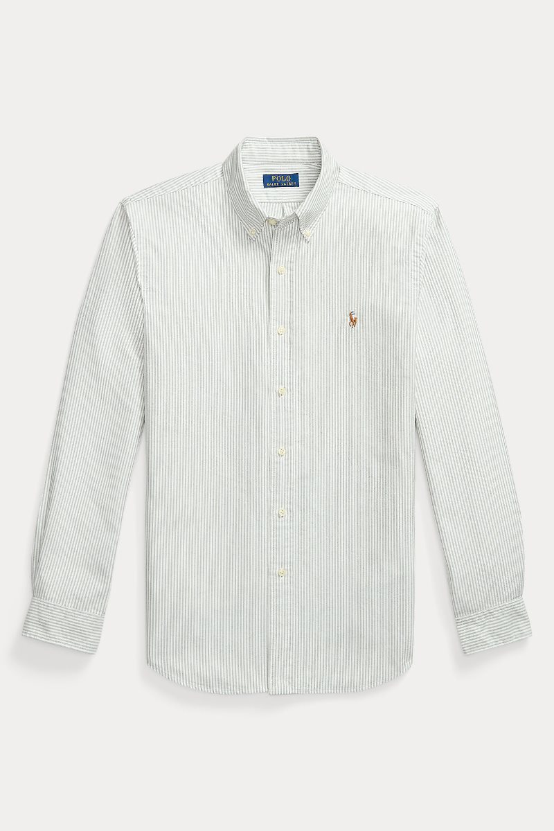Het Oxford-overhemd maakte al vroeg zijn debuut in Ralph Laurens ontwerpen en heeft sindsdien zijn status als een pijler van de Polo-look verstevigd. Vandaag de dag blijft Ralph Lauren talloze variaties op zijn iconische overhemd creƫren, waaronder deze versie die is geweven met een vleugje stretch voor extra comfort. Dit is de groen wit gestreepte uitvoering.