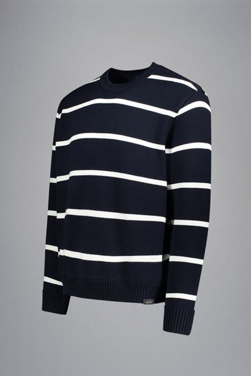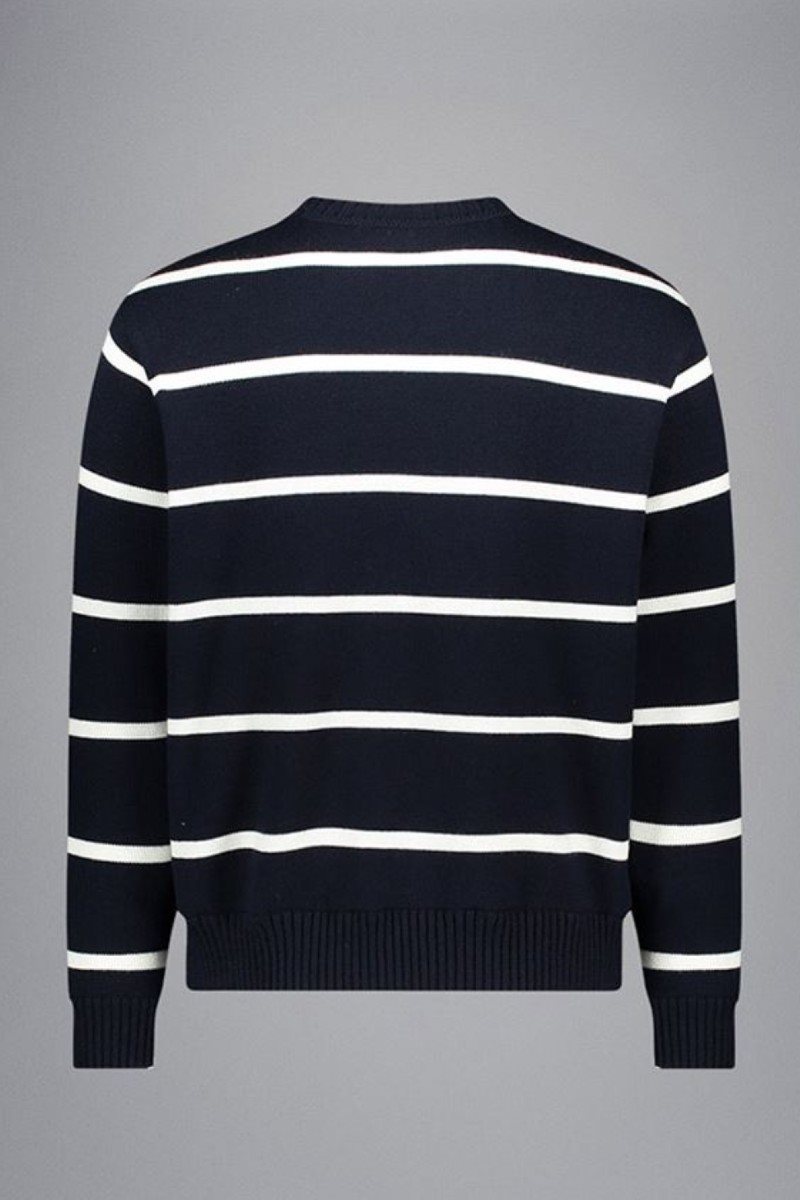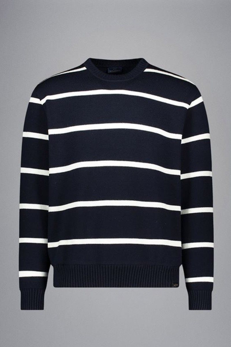 Shark tag Soft Cool Touch crewneck, gemaakt van 100% wol in een marine kleur met witte streep.