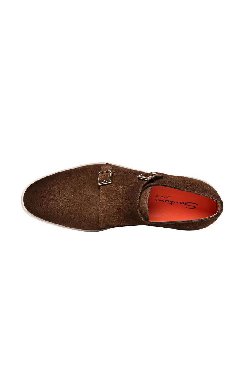 Bruine suède instappers van Santoni met rubberen zool. De schoenen hebben een dubele gespsluiting, waardoor ze casual en toch nog gekleed zijn. De rubberen zool is licht en soepel, waardoor het een gemakkelijke schoen is om te dragen.