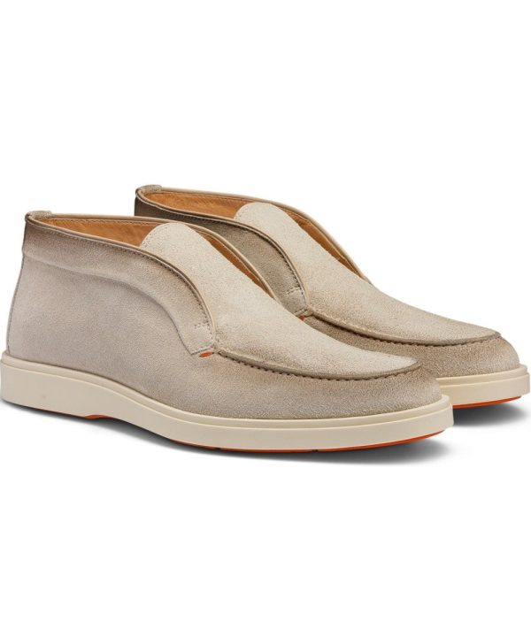 Halfhoge schoenen van Santoni met een rubberen zool. De instappers zijn van soepel suède, en hebben een leren detail aan de bovenkant met een lichte kleurovergang. Deze schoenen zijn ontzettend comfortabel, door het gebruik van soepel materiaal en de lichte rubberen zool.